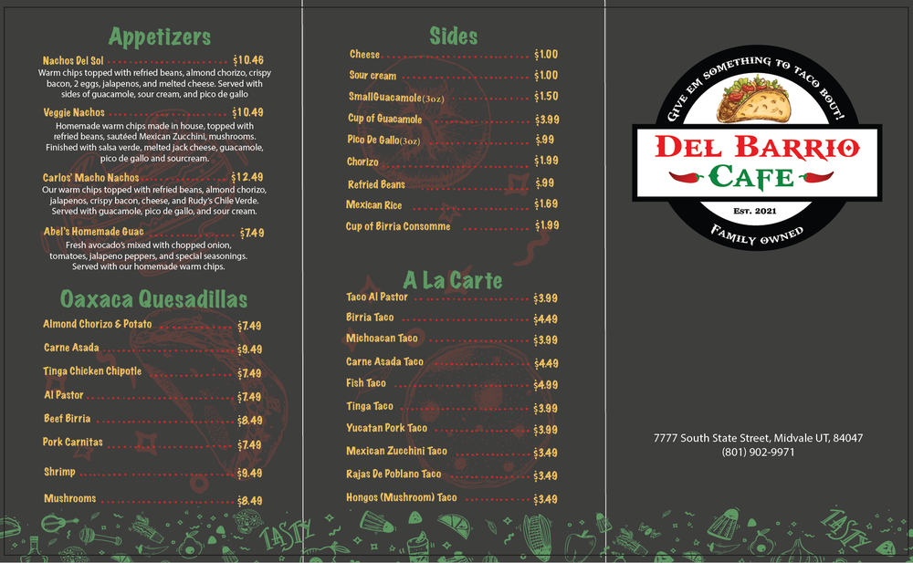 Del Barrio Cafe is a Mexican restaurant located at 7777 S State St in Midvale, UT. They offer a variety of Mexican dishes with many vegetarian options, along with delivery, takeout, and catering services. The menu features specialties like Green Pozole and Homemade Tamales, as well as appetizers like Abel's Homemade Guacamole and Quesadillas del Barrio. Customers rave about the flavorful dishes, from the loaded birria tacos to the cheesy al pastor tacos. The service is friendly, and the cozy atmosphere adds to the dining experience. While prices may be a bit higher, the quality of the food makes it worth it for a special treat. Don't miss trying the homemade lemonades and be sure to indulge in the delicious cheesy dishes at Del Barrio Cafe.